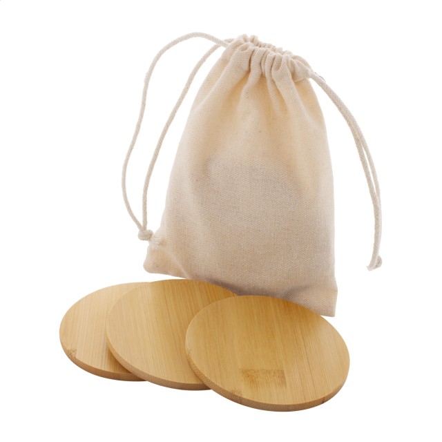 6dílná sada kulatých bambusových podtácků v bavlněném pytlíku se stahovací šňůrkou.